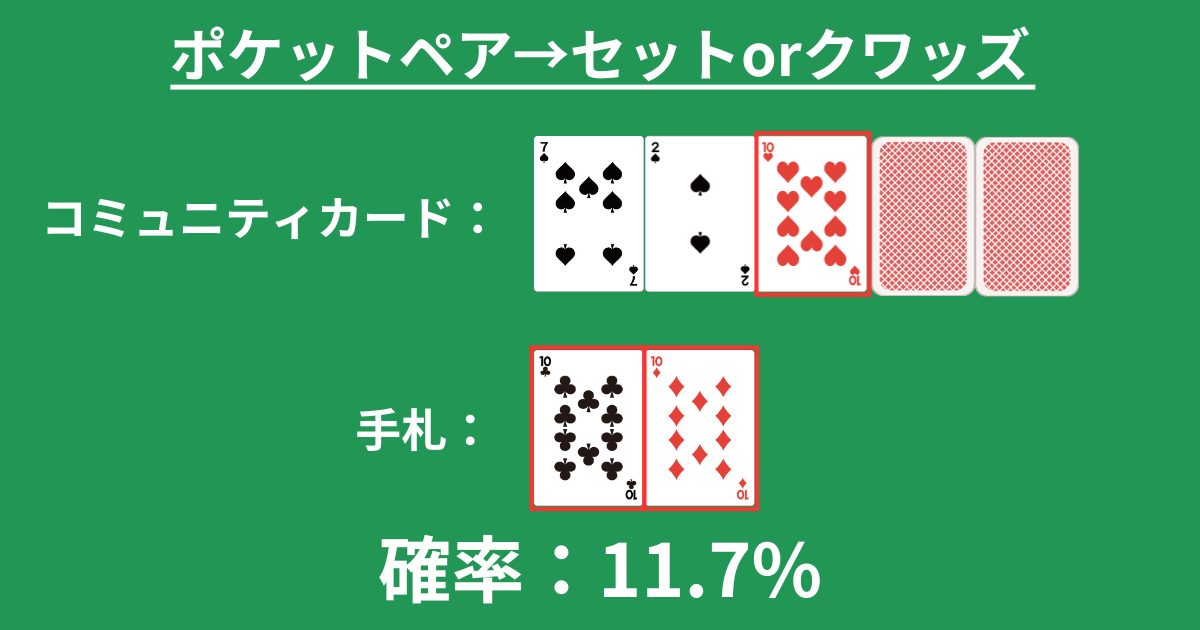ポケットペアがセット(スリーカード)やクワッズになる確率は11.7%です。