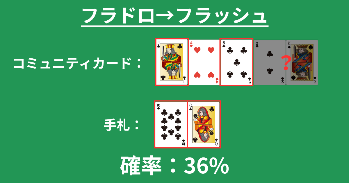 3回に1回はフラッシュが完成することになるので、フラドロが引ければフロップ以降に落ちるカードを見に行くプレイヤーが多いです。