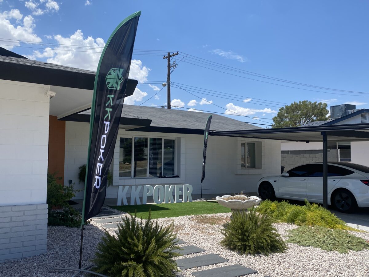 WSOPの会場から車で約10分の住宅街に位置するKK Houseに到着したプレイヤーたちを、KKPokerの旗と看板がお出迎え。看板・ネオンライト・旗などの装飾は、このKK Houseパーティーのために特注したものです✨屋外にはプライベートプールもあり、灼熱のラスベガスの暑さの中でも大好評でした☀